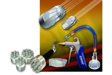 EXAIR 新 1“高功率扁平超級空氣噴嘴採用EXAIR的專利技術,以使用最小壓縮空氣產生生誘噵周遭氣流技術,同時降低噪音水平。壓縮空氣精確通過0.025”間隙空氣開口(0.64mm),設置有一個不銹鋼墊片之間定位主體和可拆卸帽。氣流在誘導周圍室內空氣產生高速的寬面渾厚氣流。空氣消耗量為17.5 SCFM(495 SLPM)在80 PSIG。在82 dBA噪音低於OSHA的最大允許噪音暴露極限值標準29 CFR1910.95(a)條件。推力和流量可以依照不同的需求是很容易來安裝調整不同厚度的墊片。可選萬向旋轉接頭和可撓性固定軟管,固定軟管上的噴嘴瞄準可調整目標物。