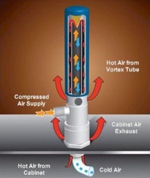 EXAIR 控制盤冷卻器使用渦流管來產生冷空氣,渦流管將壓縮空氣的供應源分成兩種氣流,一種氣流為冷空氣,另一種為熱空氣,這兩種氣流做熱交換,並從渦流管的一端產生冷空氣,經由撓性軟管排出,熱空氣則由另一端排出。
