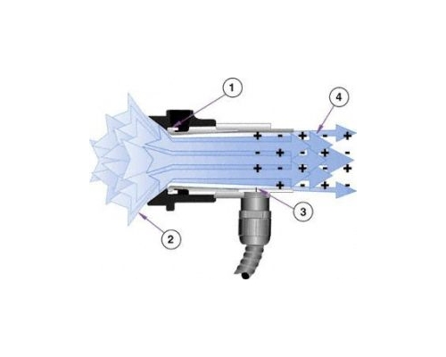 壓縮空氣的量在加農炮環形噴嘴(1)誘導大量周圍空氣的氣流通到加農砲(2)。加農砲出口端的放射針(3)釋放離子充滿整個區域。其結果是一個高容量,圓錐形離子空氣(4)在離物件15英呎(4.6m)能夠消除靜電和清潔。因為超過90%以上的電離子空氣誘導,砲型靜電消除器(離子空氣砲)產生最大氣流量和使用最小空氣消耗量。