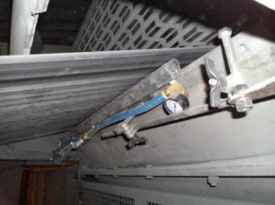 EXAIR 超級風刀(超級氣刀),與輸送皮帶行進方向相反,並針對集塵系統,如下所示。安裝前後的照片也如下所示。