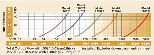 下面的圖表顯示了6個型號中的每一個的總輸出流量。例如,120021型或121021型在60 PSIG的壓縮空氣供應下運作時,總輸出流量為120 SCFM。這些相同的空氣放大器在80 PSIG下運作時總流量為146 SCFM。透過在壓縮空氣供應上簡單地使用壓力調節裝置,可以調節輸出使性能以匹配期望的結果。