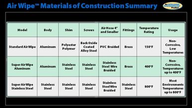 作為最後回顧,請參閱下表,全面總結EXAIR 不銹鋼和鋁超級和標準空氣擦拭器(環形風刀)的材質。